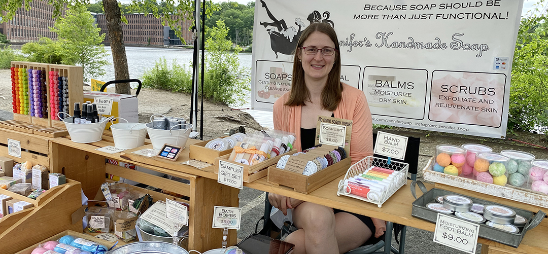 Jennifer’s Handmade Soaps Jennifer’s Handmade Soap is based in Ayer, MA and creates artistic artisan soaps. The endless design possibilities captured her love for soapmaking and continues to drive her today. “Soap should be more than just functional” sums up her stance on soap! Color and design guide everything she does. Along with her artisan soaps Jennifer offers a wide range of bath products–including lip balms, lip scrubs, hand balms, foot balms, fun shaped bath bombs, bubble bath, shower steamers, and decadent sugar scrubs! 6/28, 7/19, 8/9, 9/13